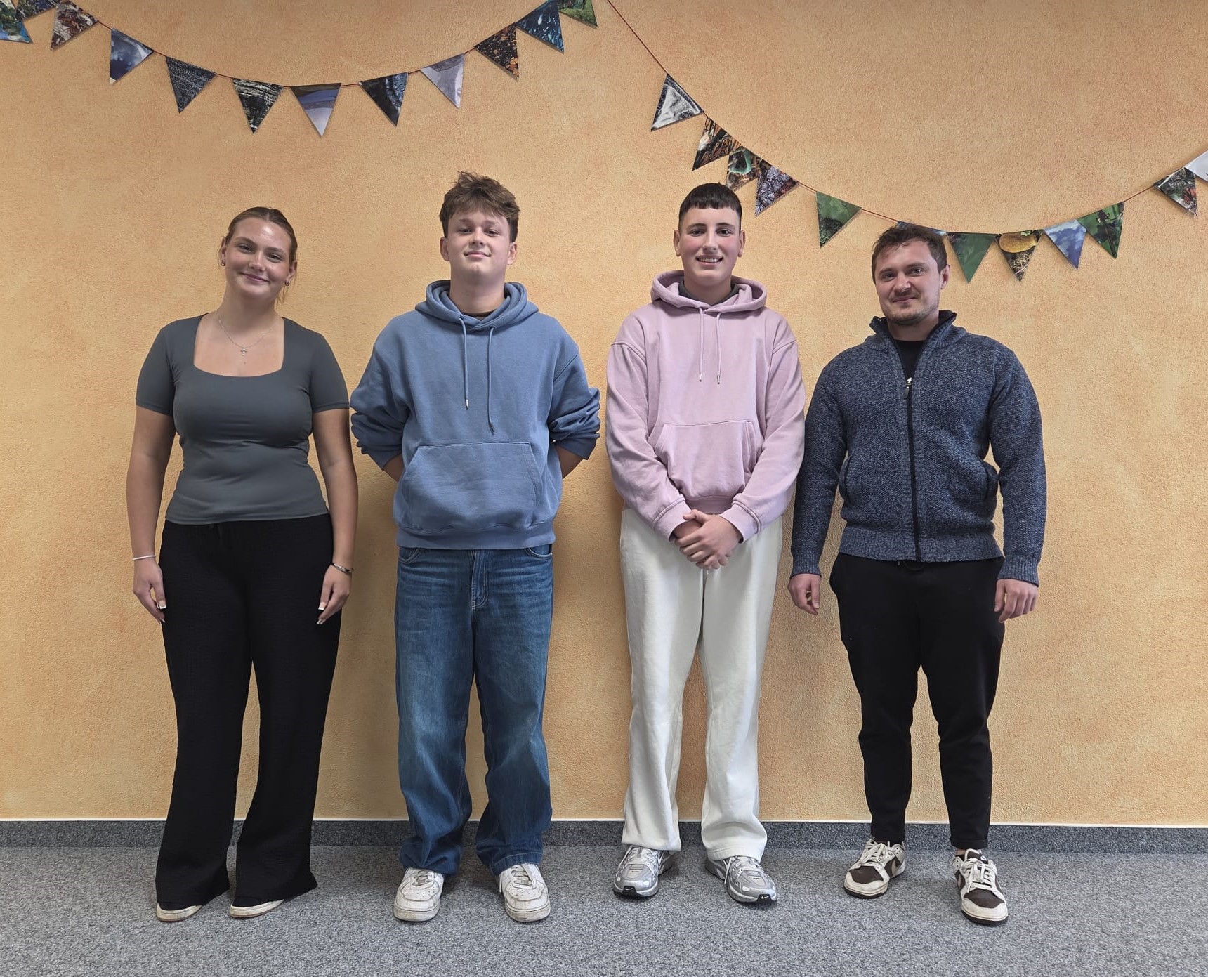 von links nach rechts: (3. Schülersprecherin) Melanie Kaiser 10AM, (1. Schülersprecher) Lenny Williams 9B, (2. Schülersprecher) Ivano Hrgić 9CM, (Vertrauenslehrer) Herr Gröner